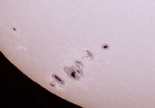 Mit einem Sonnenfinsternisbetrachter, einer Sonnenfinsternisbrille oder entsprechende Schutzfolie konnte man ohne optische Hilfsmittel am 01.Mai 2025 eine riesengroße Fleckengruppe auf der Sonne beobachten.