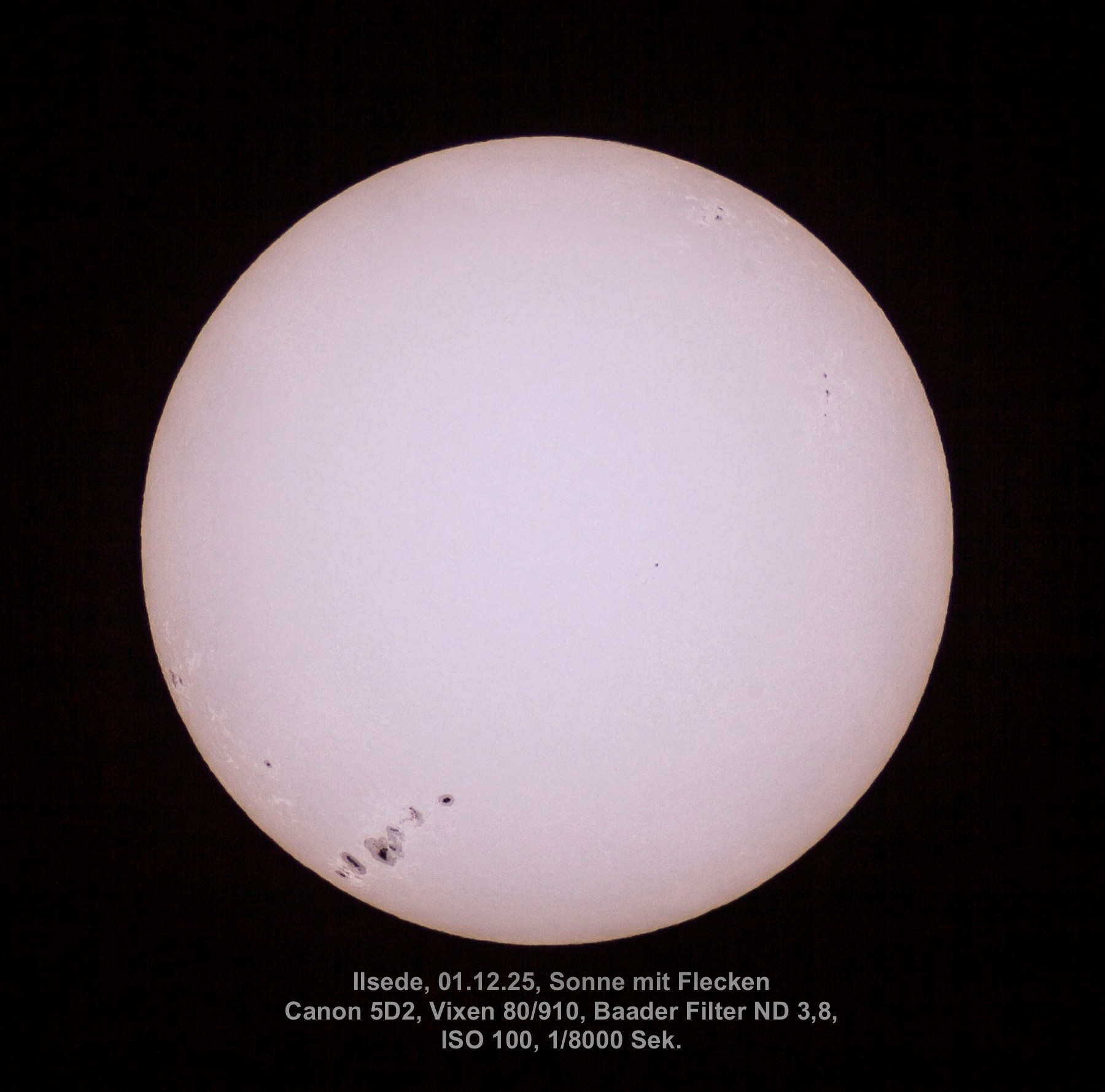 Die Sonne befindet sich zur Zeit in dem sogenannten 25. Sonnenfleckenzyklus. Der jetzige Sonnenfleckenzyklus begann etwa Ende 2019 und hat Ende 2024/Anfang 2025 seinen Höhepunkt überschritten, d.h. die Fleckenaktivität nimmt nun wieder stetig ab. Ein Zyklus dauert etwa 11 Jahre.