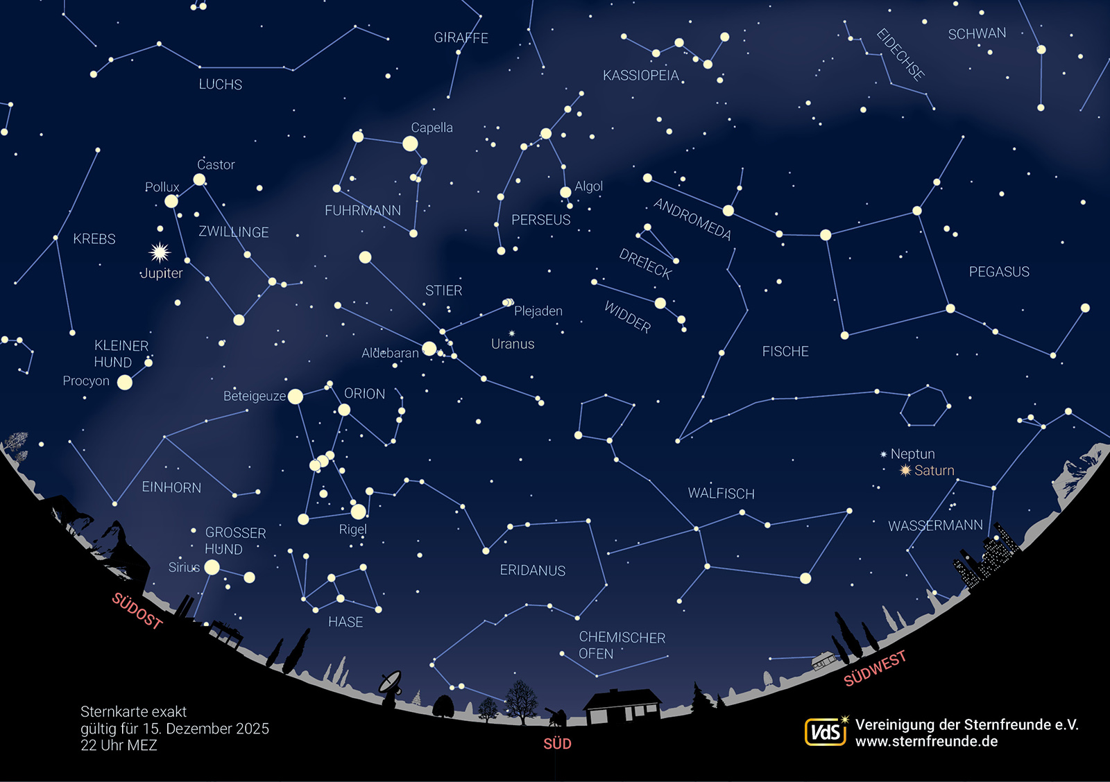 Unsere Sternkarte für die Zeit um 22 Uhr zeigt dagegen die Pracht der Wintersternbilder: Orion, Stier, Zwillinge und Fuhrmann sind bereits aufgegangen. Selbst Sirius, der hellste Fixstern am irdischen Himmel, blinkt schon über dem Südosthorizont. Im Süden und Südwesten halten sich noch die Herbststernbilder auf. Unterhalb des Herbstvierecks (das große Quadrat aus drei Sternen des Pegasus und einem Stern der Andromeda) findet man die ausgedehnten, aber nur aus lichtschwachen Sternen bestehenden Sternbilder Wassermann, Fische und Walfisch. Auch Eridanus, das Sternbild zwischen Walfisch und Orion, ist keine wirkliche Bereicherung. In einer klaren Nacht kann man aber einmal versuchen, dem Lauf des Himmelsflusses zu folgen.
