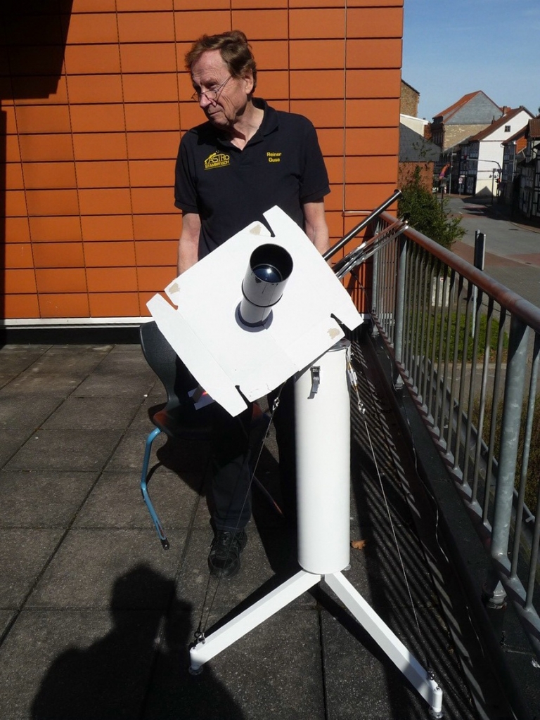 Reinhard W. seinen medientauglichen blauen Newton, Helmut R. steckte seine Kamera in den Okularauszug und zauberte danach das Sonnenbild mittels Laptop und Beamer auf die Projektionswand im Vortragsraum unterhalb der Sternwarte.